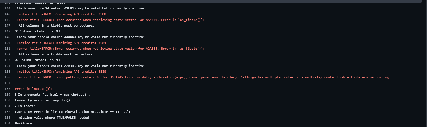 due to my original plan to pull 10 aircraft every 15 minutes (40 * 4 = 160 * 24 = 3840 API credits). We’ll want to get the barometric altitude that we stored in the simple features coordinates back out into its own column so we can show that in a table, which we can do using st_coordinates(x)[,3]